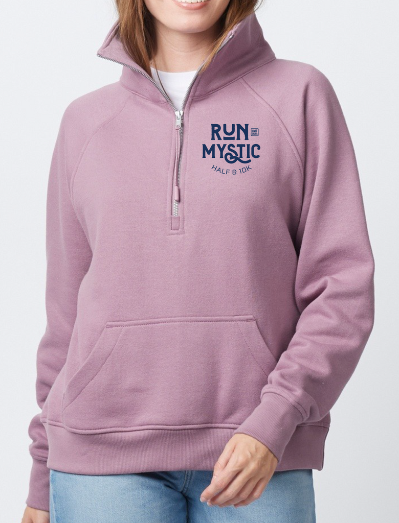 Stay cozy and stylish before and after the Mystic Half & 10K with this women's fit fleece half zip pullover. This comfortable and soft fleece is perfect for lounging or casually showing off your accomplishment. Lavender Haze with Navy text.